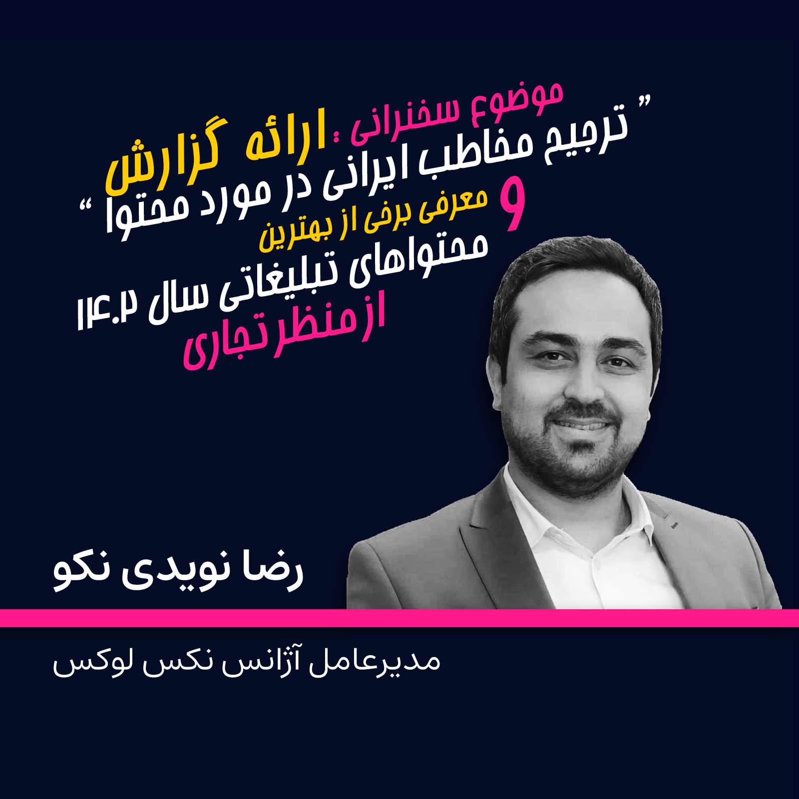 و رضا نویدی نکو، مدیرعامل شرکت تحقیقات بازاریابی نکس لوکس، بهترین محتواهای تبلیغاتی سال گذشته را معرفی کرد و در مورد ترجیح و سلیقه مخاطب ایرانی در مورد محتوای تبلیغاتی صحبت کرد.